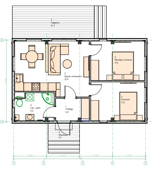Одноэтажный дом общей площадью около 59 кв. м будет органично смотреться на небольшом участке. Он хорошо подойдет для проживания небольшой семьи или станет комфортабельным домиком для гостей.